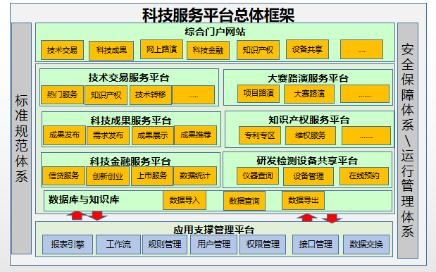 綜合考慮業(yè)務需求與管理現(xiàn)狀以及未來的發(fā)展趨勢,充分體現(xiàn)以服務為導向,構建一套包括綜合門戶網(wǎng)站、政策信息推送平臺、技術交易服務平臺、科技成果服務平臺、大賽項目路演平臺、科技金融服務平臺、知識產(chǎn)權服務平臺、研發(fā)檢測設備共享平臺、創(chuàng)新創(chuàng)業(yè)服務平臺等功能于一體的科技服務平臺。