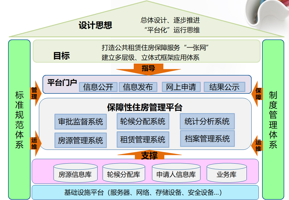 保障性住房管理平臺是為貫徹落實《國務院關于積極推進“互聯網+”行動的指導意見》(國發〔2015〕40號)、《國務院關于印發促進大數據發展行動綱要的通知》(國發〔2015〕50號)以及《廣東省人民政府辦公廳關于印發廣東省“互聯網+”行動計劃(2015-2020年)的通知》有關“互聯網+住房保障”,發展互聯網住房保障服務,促進各類公租房、廉租房、經濟適用房管理網絡化、透明化而建設的信息化平臺。平臺運用總體設計、逐步推進“平臺化”運行思維,打造公共租賃住房保障服務“一張網”建立多層級、立體式框架應用體系,實現保障性住房規劃、房源籌集、信息公開、網上申請、審核公示、輪候分配、租賃管理、檔案管理、統計分析等一體化管理,實現跨部門信息共享和保障資格動態化管理 。