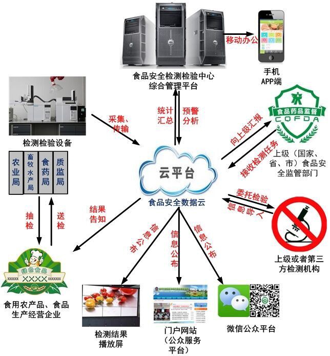 (1)可實現全市(區)農產品質量安全統一檢測檢驗計劃、統一檢測檢驗管理、統一檢驗項目標準、統一檢測結果匯總、統一信息報告和發布等“五個統一”的信息管理平臺,實現農產品質量安全生產、加工、流通、消費各環節檢驗檢測實現合理分工、集中配置、資源共享、穩步推進。同時開發手機APP客戶端實現移動辦公管理。
