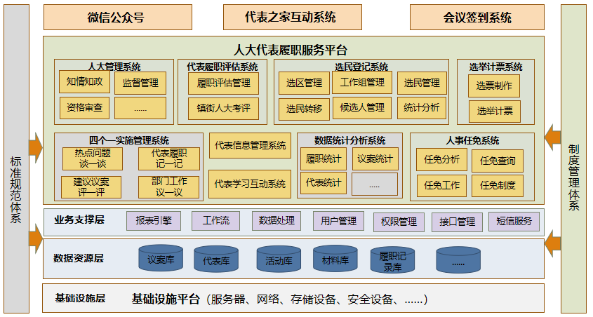平臺建設本著“統籌規劃、分步實施、協同推進”的基本原則,既注重業務流程電子化,提高辦公效率,更注重支撐人大代表履行職能,提高效能;從獨立封閉的建設方式,轉向與相關部門的協同互動和資源共享;從粗放式、離散化的建設模式,轉向集約化、整體化的可持續發展模式。通過信息化系統建設,逐步形成服務領導決策、代表履職、機關辦公、信息采集、信息交換、服務公眾參與,與黨政系統互聯互通的內外網絡業務管理集群,支撐提高立法質量和監督實效的業務應用,從而實現人大工作全面信息化,擴大人大影響,提高人大代表組織管理能力和服務能力。
