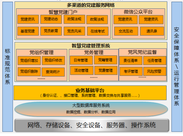 數據庫是“智慧黨建”運行的重要基礎。“智慧黨建”數據庫應至少包括以下三個方面的子數據庫:一是黨員、黨組織信息數據,包括黨員信息和各級黨組織信息;二是黨組織活動數據庫,包括各級黨組織活動開展情況和網上黨支部的建立;三是資源數據庫,包括各種規章、制度、黨員教育資料、網絡學習資料以及各種相關軟件資源等。
